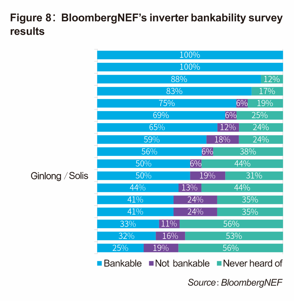 La encuesta de BloombergNEF preguntó a los bancos, desarrolladores y firmas técnicas de diligencia debida qué marcas, de 48 fabricantes de módulos y 17 fabricantes de inversores, consideraban bancables.