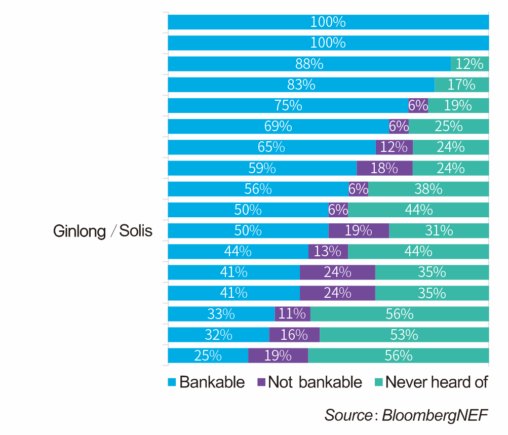 Pour cette enquête, BNEF a recherché des informations auprès de banques, de développeurs et de cabinets d'audit spécialisés en diligence raisonnable dans le domaine technique, pour savoir quelles sont les marques, parmi 48 fabricants de modules et 17 fabricants d'onduleurs, qu'ils considèrent être viables financièrement.