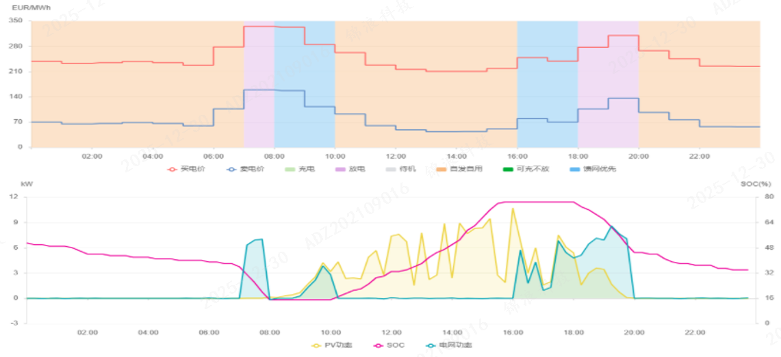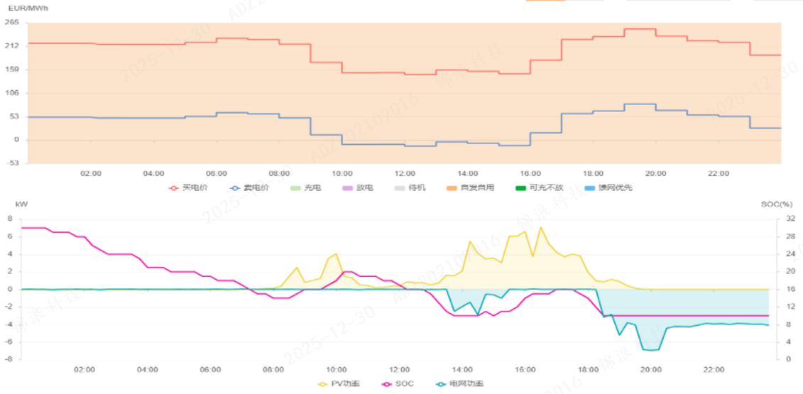 The system charges the battery during low-cost, off-peak hours and uses stored energy during expensive peak periods — effectively “store low, use high”.