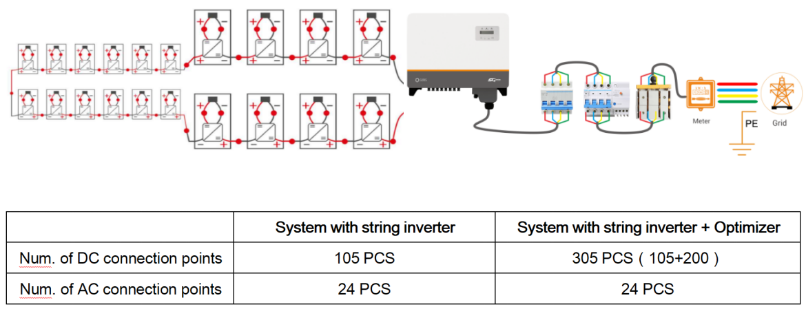 The larger the system, the more connection points. Adding MLPE devices to the original system triples the number of connection points. In Figure 3 below, only an optimizer is added, and the connection points of the string are increased by 40.