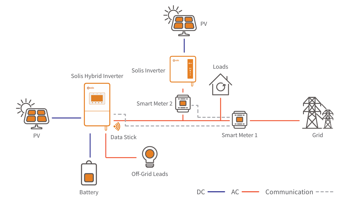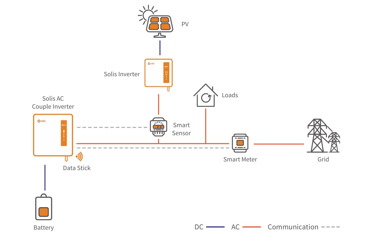 In questaconfigurazione, l'inverter Solis accoppiato in AC carica o scarica la batteria in base aidatidelcontatoreintelligente.