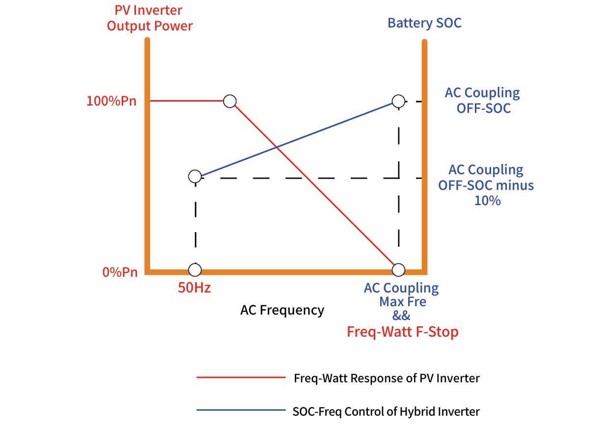 Quando lo stato di carica (SOC) dellabatteriascende del 10% al di sotto del valore OFF-SOC, l'inverteribridoaumenta la frequenza, inducendol'inverter PV a ridurre la potenza di uscitafino a quandoil SOC non raggiungenuovamenteilvalore OFF-SOC.