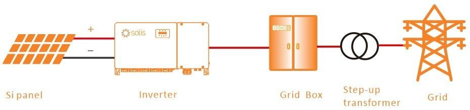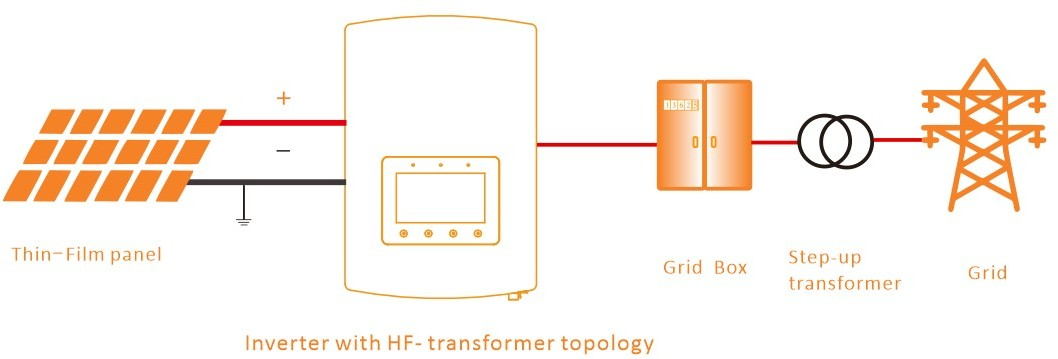 Per gli inverter con topologia senza trasformatore, in una soluzione di pannello PV in pellicola sottile, un trasformatore di frequenza viene processato all’estremità d’uscita. Il primo trasformatore non è messo a terra ed i trasformatori trifasi sono consigliati di usare il metodo di connessione "△, Y" , l’estremità più vicina all’inverter è "△" .