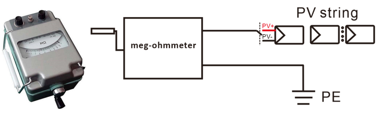 또한 메그오옴 미터를 사용하여 모듈 측 접지 측 PV+/PV 라인 엔드의 절연 저항을 직렬로 측정할 수 있습니다. 값은 2MΩ보다 커야 합니다.