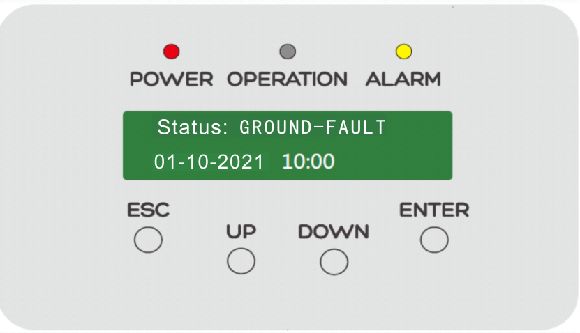 태양광 발전 시스템에서 접지 결함이 발생하면 인버터가 작동을 시작할 때 "접지 결함" 경보를 표시하며 경보 코드는 1033H입니다. 동시에 고장이 제거될 때까지 급전망에서 연결이 끊어집니다.