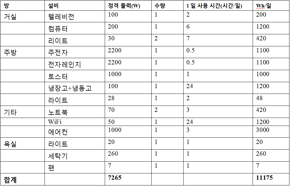 32725W ÷ 0.8 (시스템 손실)=4656.25W 1일