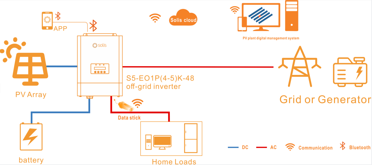 솔리스 독립형 인버터 시리즈는 저장으로 다양한 사용 시나리오의 요구에 적응할 수 있습니다. 예를 들어 발전기와기 통합 등.
