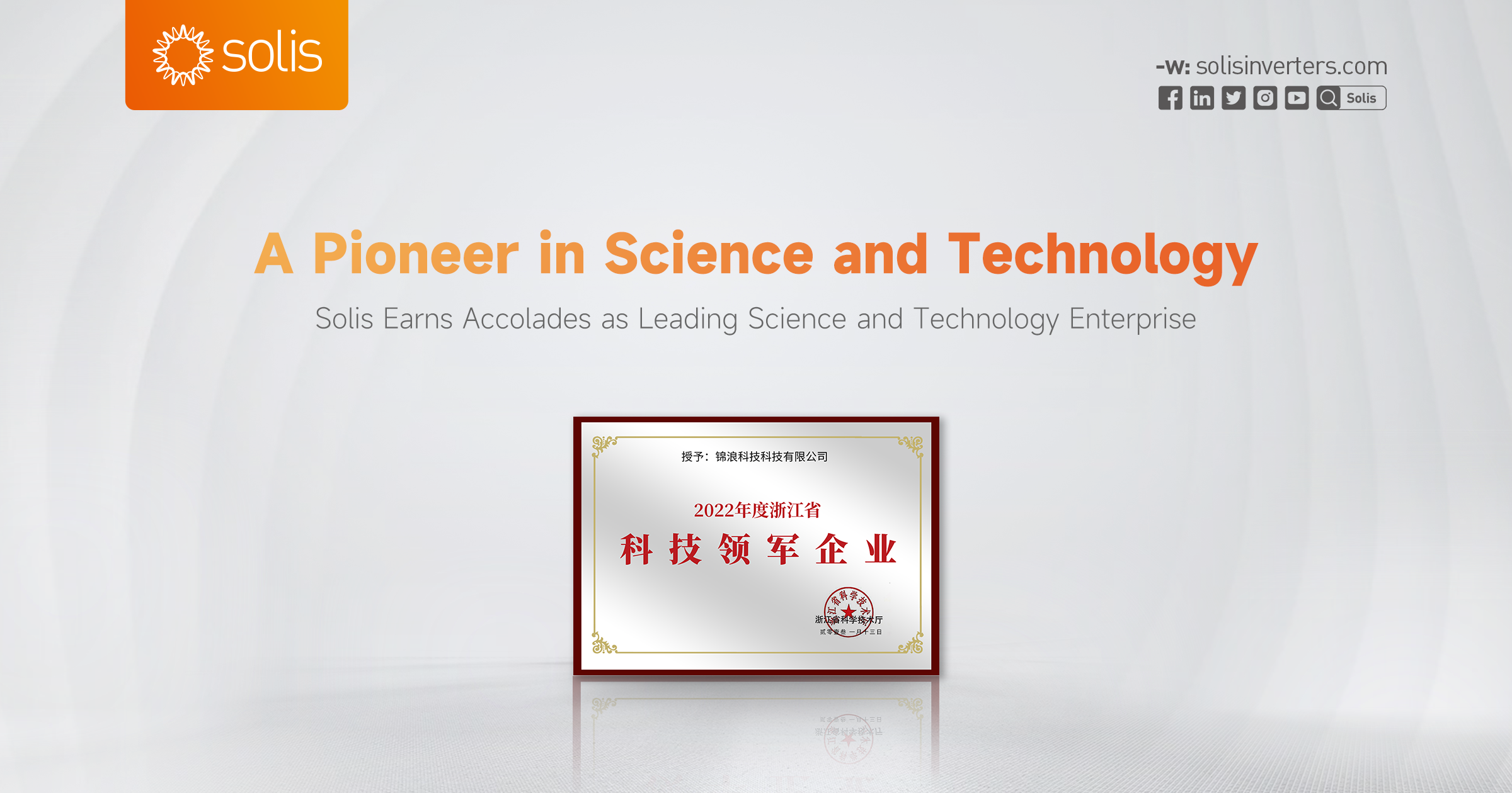 16th Feb,Ningbo City, China: Ginlong (Solis) Technologies, one of the most experienced and largest inverter producers in the world is delighted to announce its listing by Zhejiang Province's Science & Technology Department as a leading Science and Technology Enterprise.