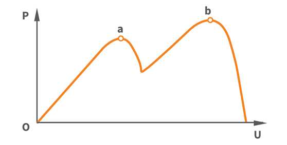 Wanneer bepaalde modules worden beschaduwd, kan de P–U-curve (vermogen versus spanning) meerdere pieken vertonen. Als alleen lokale MPPT-tracking wordt gebruikt, kan de omvormer een lokaal maximum (punt a) ten onrechte identificeren als het werkelijke globale maximum.