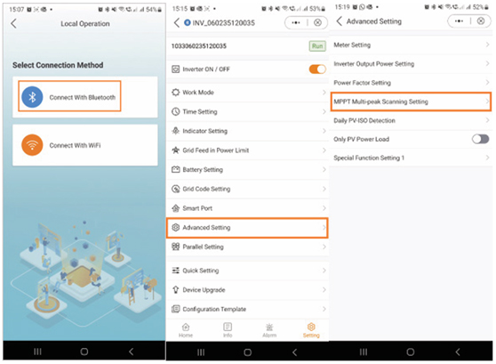 Bluetooth-verbinding → Instellingen → Geavanceerde instellingen → MPPT Multi-Peak Scanning