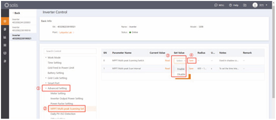 Omvormerbesturing → Geavanceerde instellingen → MPPT Multi-Peak Scanning