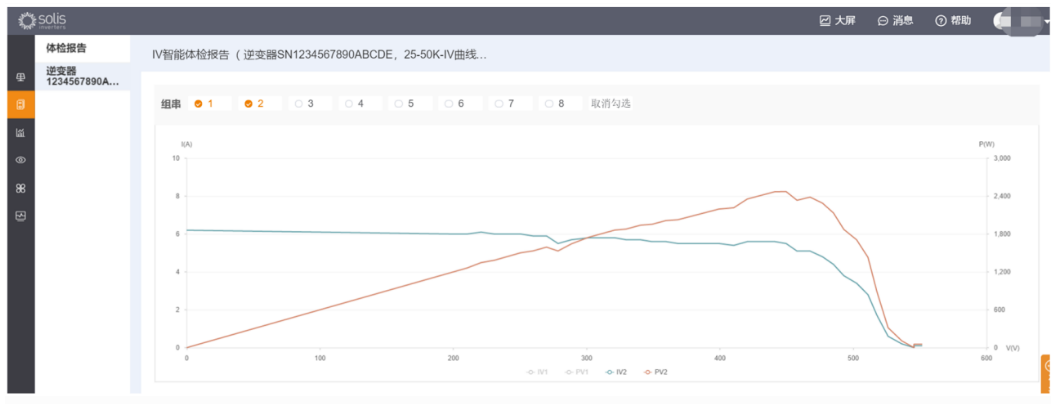 Deze case is de toepassing van de I-V curve in een C&I project. Alle gegevens op siteniveau zijn op afstand gescand via SolisCloud, een van de tekenreeksen bleek curvekenmerken ① te tonen in figuur 6, de I-V en P-V-curve wordt als volgt weergegeven: