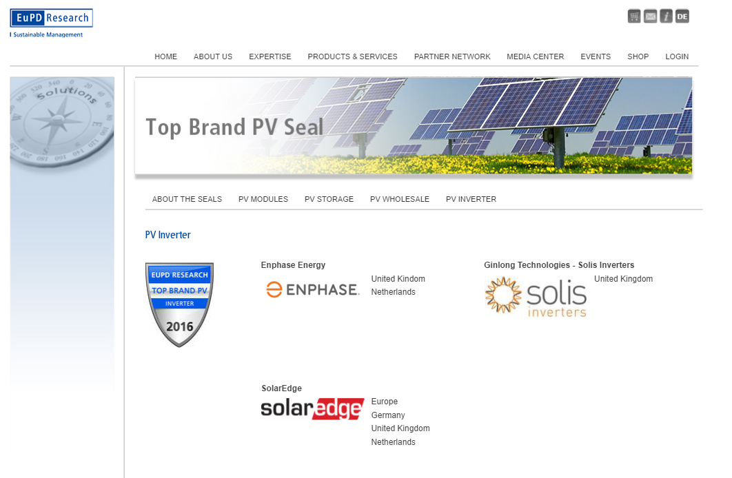 Jak skuteczne jest zarządzanie marką różnych producentów modułów, falowników i magazynów energii? Każdego roku przeprowadzamy ogólnoeuropejskie badania i przygotowujemy niezależną ocenę postrzegania wielu marek. Najlepsze marki otrzymują nagrodę Top Brand PV Seal w różnych kategoriach.