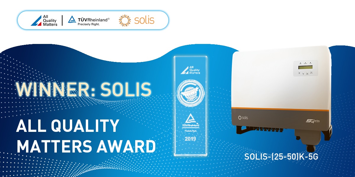 Jiangsu, Chiny – 30 czerwca 2020 r. W Suzhou w Jiangsu odbyła się ceremonia wręczenia nagród Solar Congress „All Quality Matters”, organizowana przez TÜV Rheinland. Komercyjne falowniki Solis (25-50) K-5G od Ginlong Solis zostały uhonorowany nagrodą TÜV Rheinland „All Quality Matters” dzięki wyjątkowej jakość produktu w 2020 roku.
