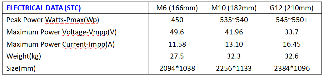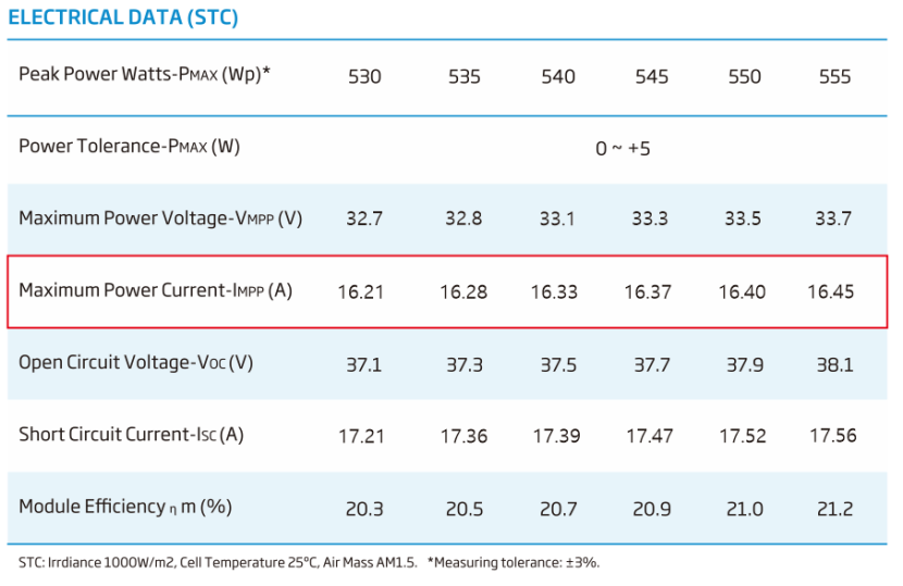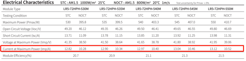 Ponieważ prąd wyjściowy modułu słonecznego jest związany z jego obszarem: im większy obszar, tym większy prąd wyjściowy. Patrząc na poniższy rysunek 1, arkusz danych dla zakresu modułów słonecznych 530 - 550 w M10 (182 mm), prąd wyjściowy modułu w normalnych warunkach pracy jest mniejszy niż 15 A; a w przypadku obszarów o wysokim promieniowaniu przy dużym współczynniku odbicia gruntu, moduł ogniwa krzemowego 182 mm może osiągnąć 15 A, natomiast w przypadku modułu G12 (210 mm) - prąd przekroczy 15 A, jak pokazano na rysunku 2.