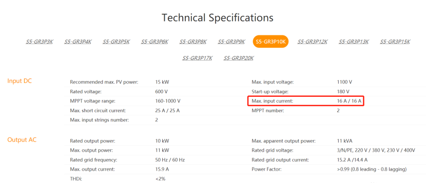 Na przykład, patrząc na poniższy arkusz danych, falownik Solis 3-fazowy 10 kW posiada maks. prąd wejściowy 2*16 A lub 16 A na MPPT