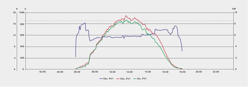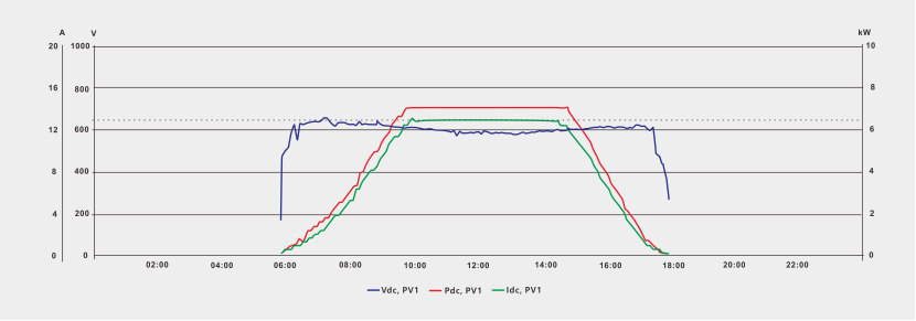 Widać to wtedy, gdy natężenie promieniowania modułu PV jest wysokie, a jego prąd przekracza 15 A i jest bliski 16,3 A. Ze względu na kompatybilność falownika prąd łańcucha nie jest ograniczony, a wytwarzanie energii jest maksymalne.