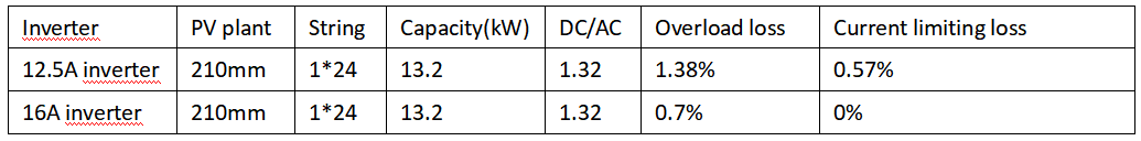 W eksperymencie zastosowano moduły 210 mm G12, a pojemność pojedynczego falownika po stronie DC wynosiła 13,2 kW. W przypadku korzystania z falownika 12,5 A strata spowodowana przez limit prądu po stronie DC falownika wynosiła 6,16 kWh, co odpowiada prawie 14% utracie mocy.