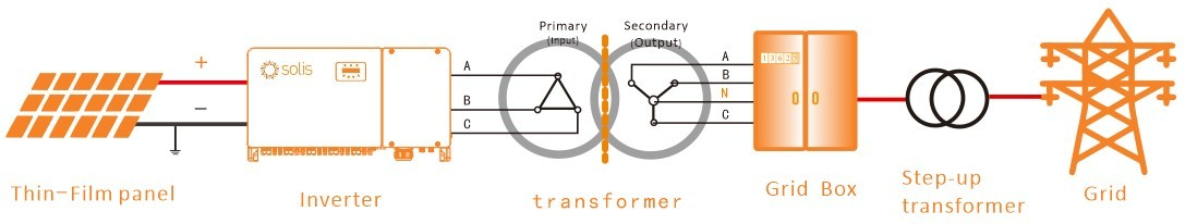 W przypadku falowników o topologii beztransformatorowej, w cienkopowłokowym systemie PV, transformator częstotliwości musi być przetworzony na wyjściu. Uzwojenia pierwotnego transformatora nie są uziemione, a transformatory trójfazowe są zalecane do stosowania metody połączenia „△, Y”, a koniec znajdujący się najbliżej falownika to „△”.