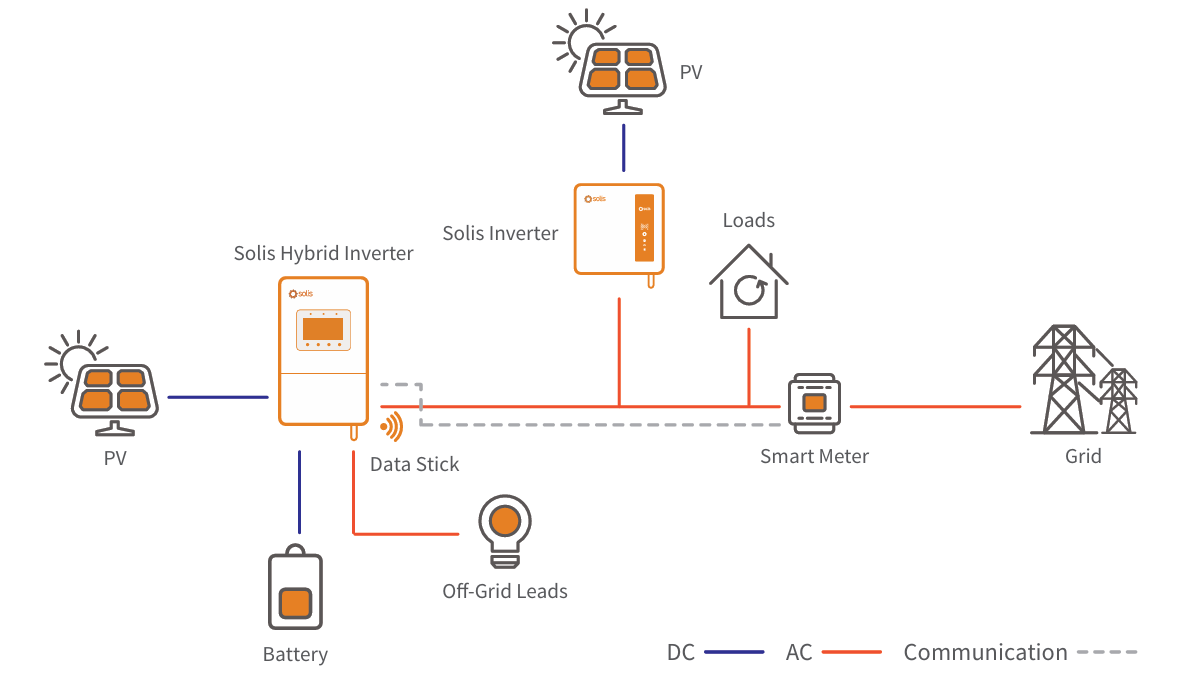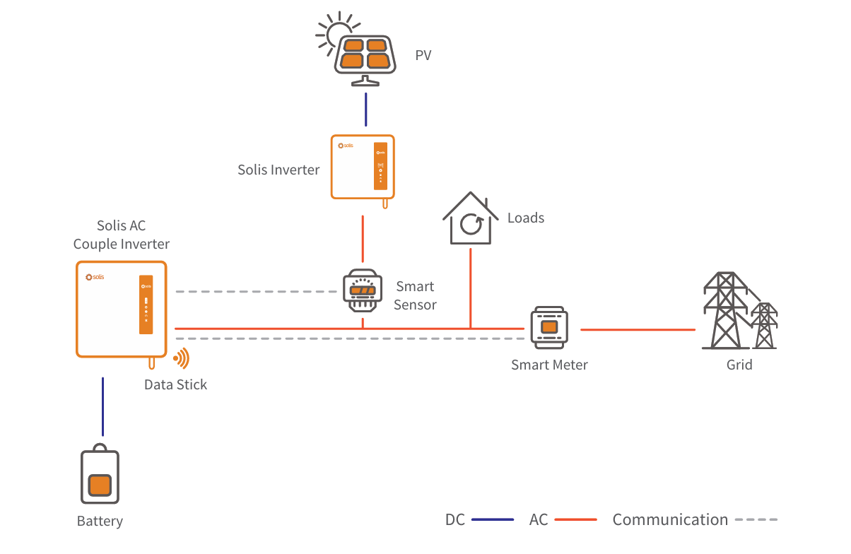 Neste cenário, o inversor Solis acoplado em AC carrega e descarrega a bateria com base nos dados do medidor inteligente.