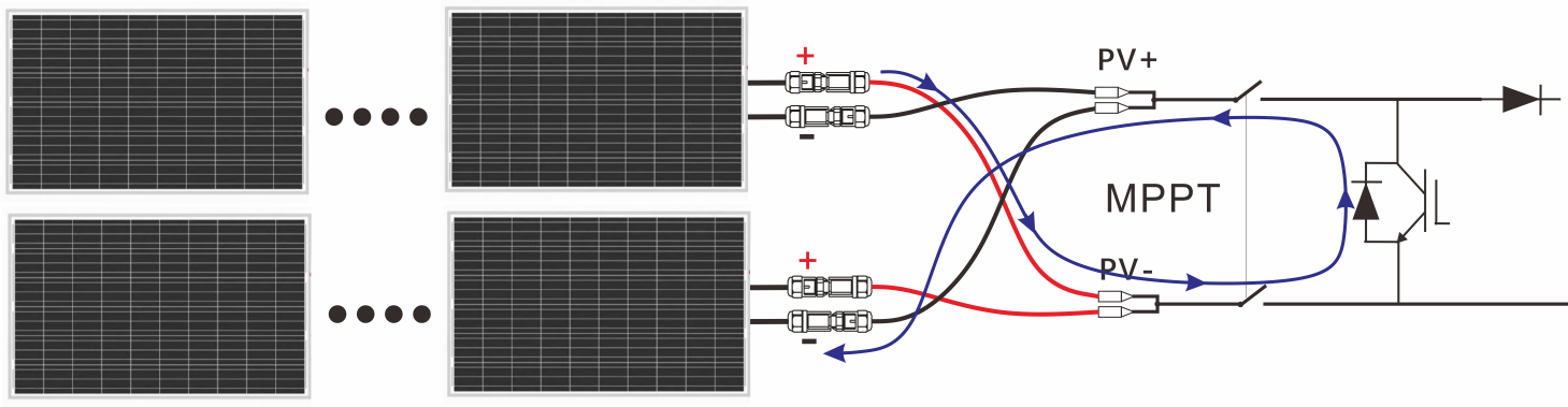 Aynı MPPT kanalında, iki fotovoltaik dizinin polaritesi tersine dönmüştür