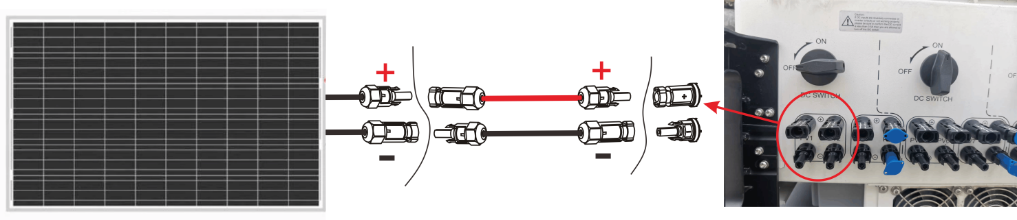 ② İnvertör tarafı referans alındığında, kırmızı kablonun “+” konektörü invertörün DC arayüzünün “+” konektörüne karşılık gelir, siyah kablonun “-” konektörü ise, invertörün DC arayüzünün “-” konektörüne karşılık gelir;